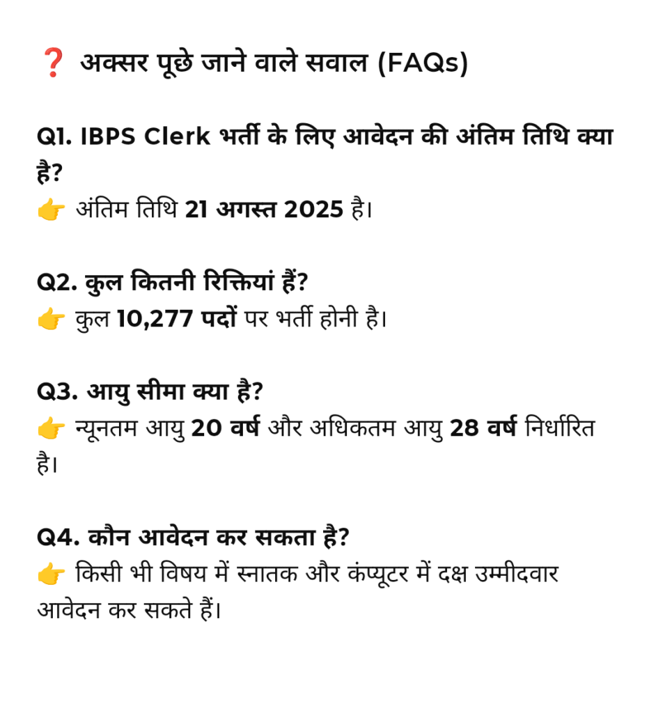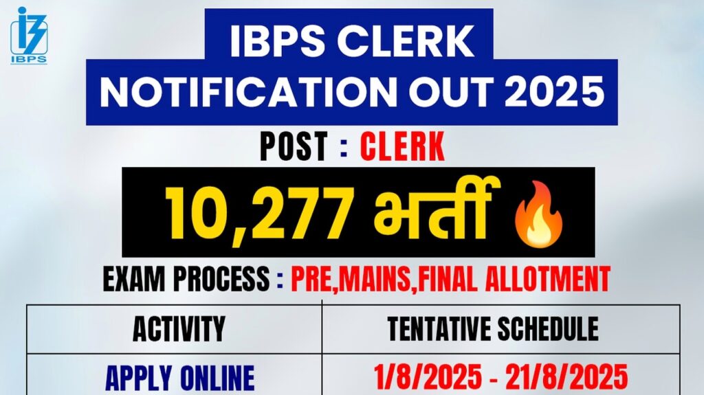 अगर आप बैंकिंग क्षेत्र में काम करने की तैयारी कर रहे हैं तो आपके पास एक अच्छा अवसर है। IBPS (Institute of Banking Personnel Selection) ने 10,277 पदों पर क्लर्क CSA 15th XV Recruitment 2025 के लिए ऑनलाइन आवेदन प्रक्रिया शुरू कर दी है। यह भर्ती सभी वर्गों के लिए खुली है और 21 अगस्त 2025 तक आवेदन करने की अंतिम तिथि है। इस लेख में हम आपको इस भर्ती के बारे में A-to-Z जानकारी देंगे, जैसे— आवेदन प्रक्रिया, योग्यता, आयु सीमा, महत्वपूर्ण तिथियां, आवेदन शुल्क और अन्य महत्वपूर्ण विवरणों को शामिल करें।