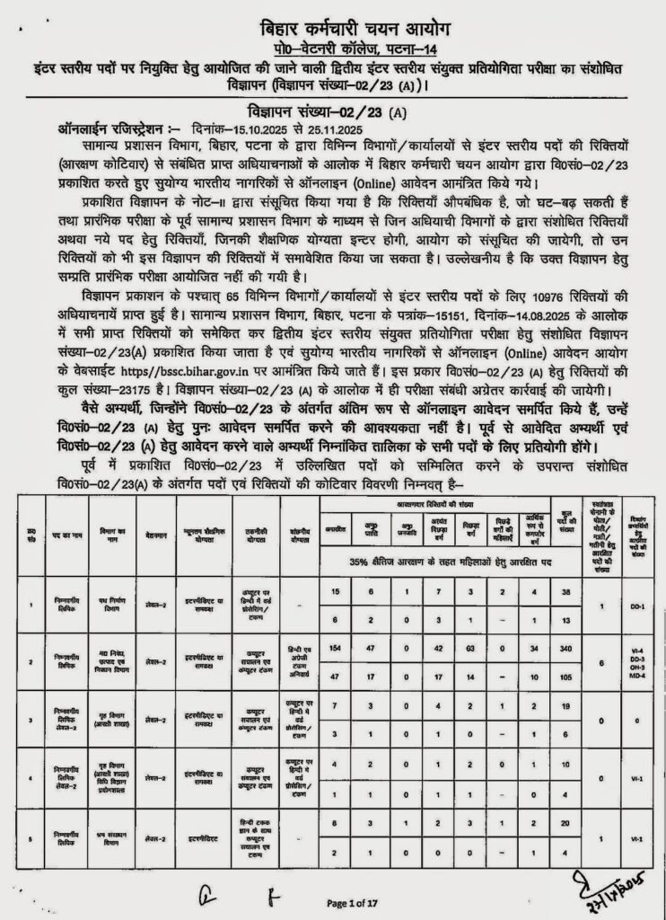 बिहार कर्मचारी चयन आयोग ने इस बार इंटर लेवल की 23,175 भर्तियाँ निकाली हैं। विभिन्न विभागों में ये पद भरे जाएंगे, जिनमें शामिल हैं—