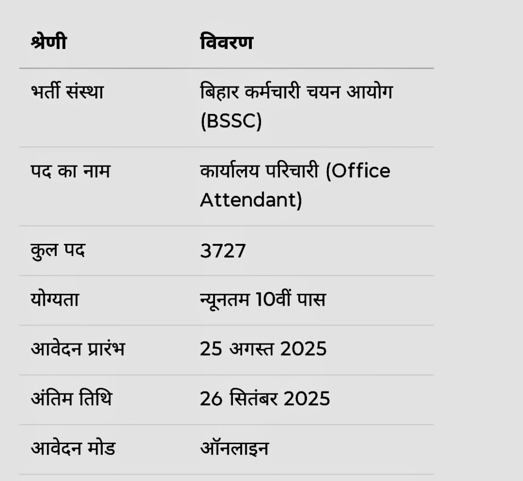 वर्ष 2025 के लिए बिहार कर्मचारी चयन आयोग (BSSC) ने कार्यालय परिचारी पदों पर भर्ती की अधिसूचना जारी की है। यह भर्ती सरकारी नौकरी की तलाश में रह रहे उन युवाओं के लिए एक अच्छा अवसर है। ताकि हर उम्मीदवार को समान अवसर मिले, इस लेख में हम आपको A-to-Z भर्ती प्रक्रिया से जुड़ी सभी जानकारी देंगे।