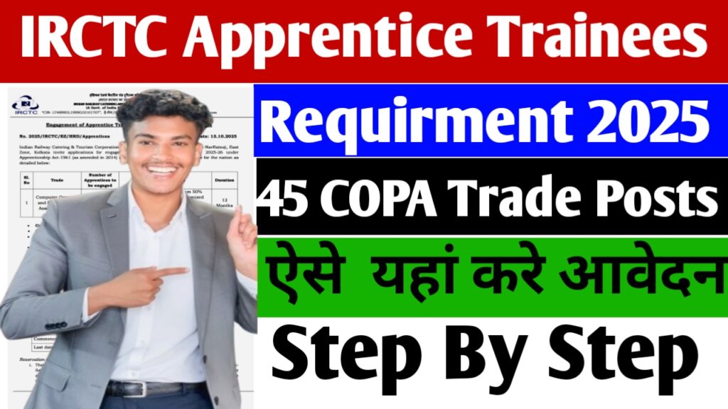 IRCTC Apprentice Trainees Recruitment 2025: ITI (COPA Trade) किया है और रेलवे क्षेत्र में अनुभव चाहते हैं तो यह सुनहरा मौका है। यह भर्ती उम्मीदवारों को न केवल नौकरी का अवसर देती है, बल्कि उनकी क्षमता को विकसित करने का भी मौका देती है।