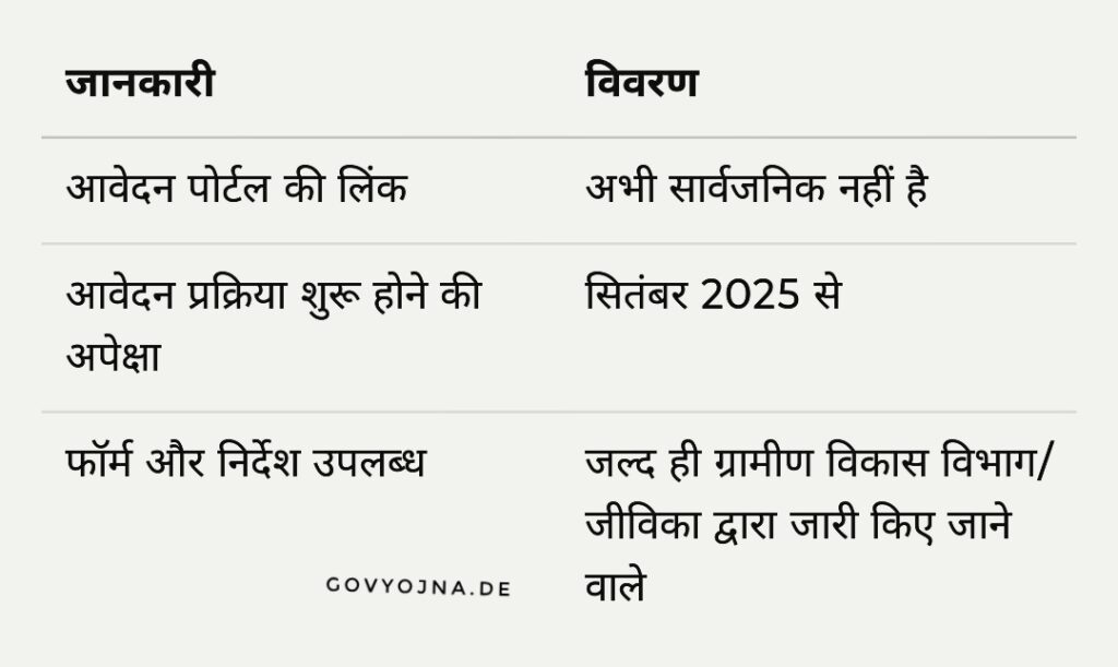 समाचार पत्रों ने इसकी सूचना दी है, लेकिन सरकारी वेबसाइटों पर (जैसे bihar.gov.in, ग्रामीण विकास विभाग की आधिकारिक साइट या जीविका की आधिकारिक साइट) अभी तक कोई स्पष्ट आवेदन लिंक या फॉर्म नहीं देखा गया है। फिलहाल, सबसे अधिक जानकारी समाचार माध्यमों से मिलती है: