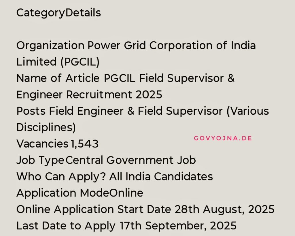 यदि आप भी इंजीनियरिंग या डिप्लोमा कर चुके हैं और PGCIL जैसी प्रतिष्ठित कंपनी में अपना करियर बनाना चाहते हैं, तो यह आपके लिए एक सुनहरा अवसर है। ताकि आप आसानी से आवेदन कर सकें और नौकरी पा सकें, इस लेख में हम आपको PGCIL Field Supervisor & Engineer Recruitment 2025 की पूरी जानकारी देंगे।