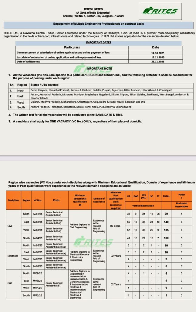 RITES ने इस बार वरिष्ठ तकनीकी सहायक पदों को कई शाखाओं (Civil, Electrical, Mechanical, Chemical, etc.) और क्षेत्रों (North, South, East, West) में विभाजित किया है। 🔹 शाखा-वार पद प्रदान