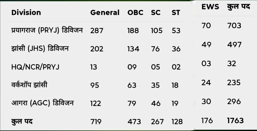 इस भर्ती में प्रयागराज, झांसी, आगरा और हेडक्वार्टर समेत विभिन्न डिवीजनों के लिए कुल 1763 पद निकाले गए हैं।