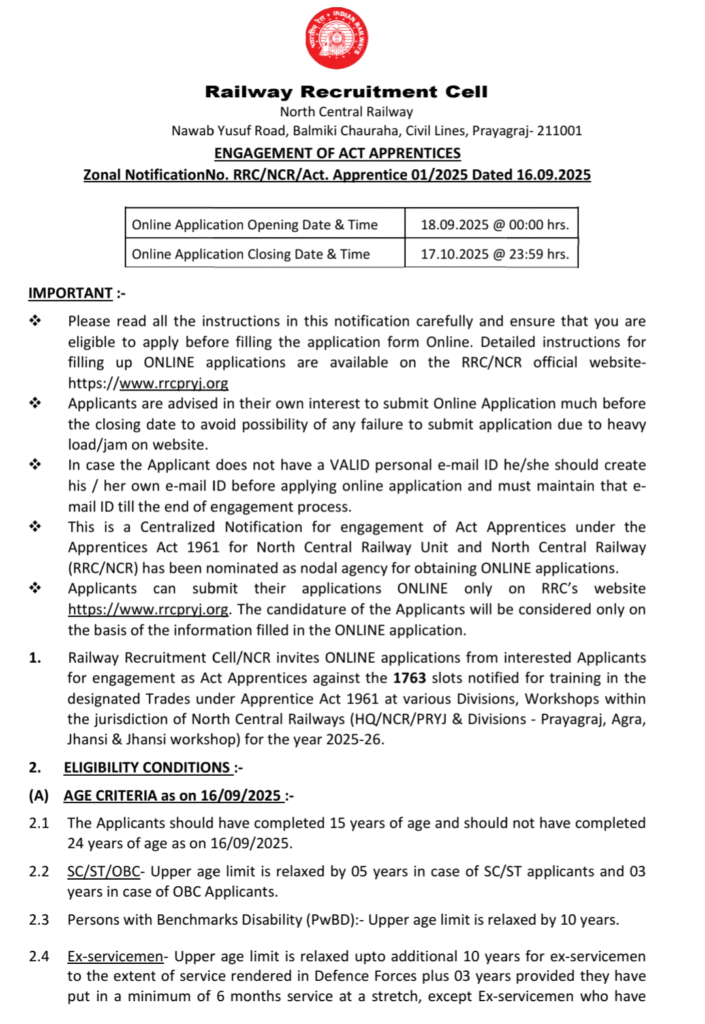 - विज्ञापन संख्या RRC/NCR/Act. Apprentice 01/2025