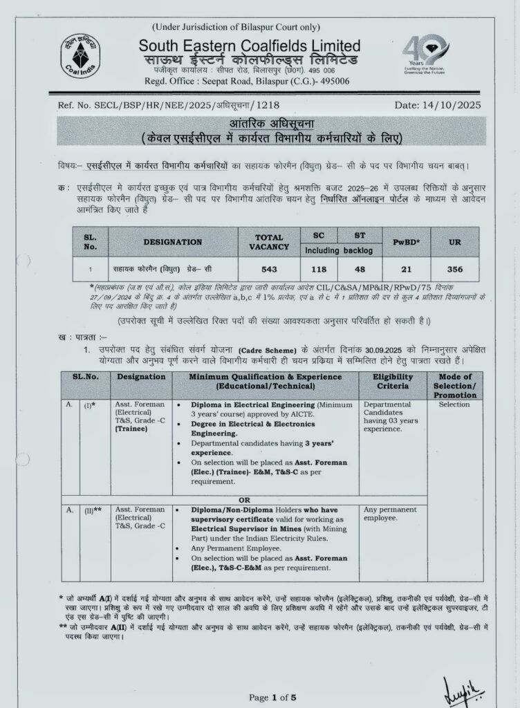 सूचना की संख्या SECL/BSP/HR/NEE/2025 है। सूचना/1218