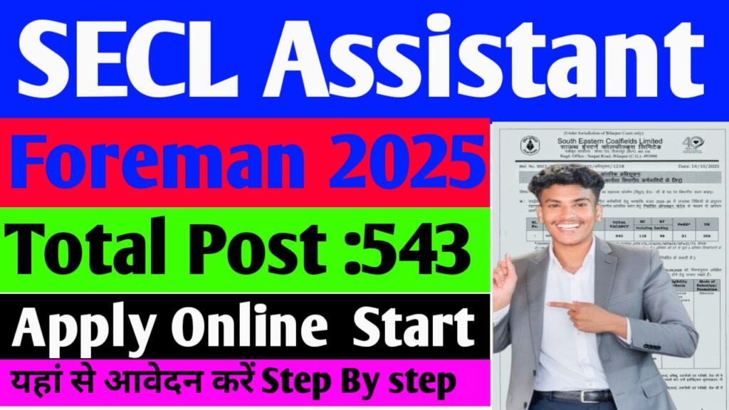 SECL Assistant Foreman Recruitment 2025 सरकारी नौकरी चाहने वाले सभी उम्मीदवारों के लिए एक अच्छा अवसर है। इस भर्ती में कोई शुल्क नहीं है और कुल 543 पदों पर आवेदन मांगे गए हैं।